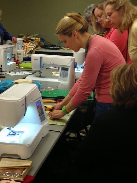 On Thursday afternoon I participated in Edyta's spool quilt workshop. Her preparation for class and her generosity is amazing. She provided each of us with two pieces of fabric to cut into 24 strips that we then exchanged with each other in order to ensure that everything worked well together and was good quality. Much better than taking whatever people brought from their stash! We only completed one spool in the class which was fine - the Janome machine I was using was giving me fits so I would much rather work on them at home.